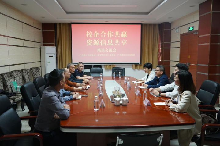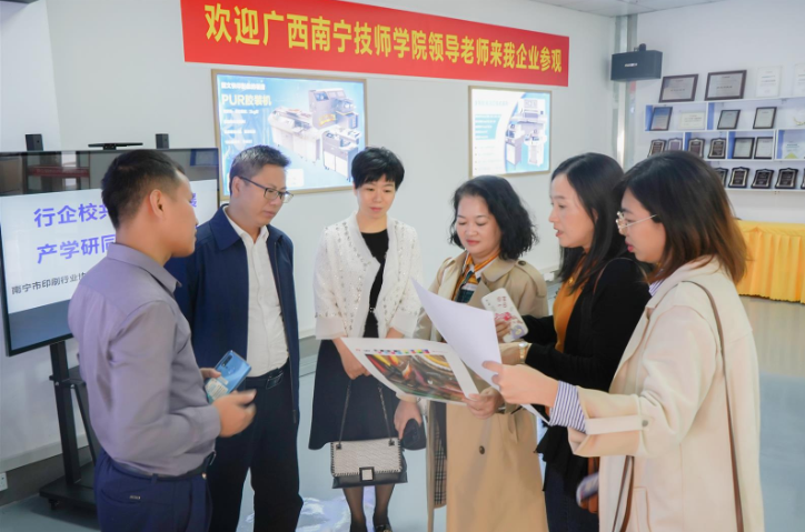 当天,调研组走访参观了江南区鸿基工业园思彩科技、艺佳合“色彩管理”实验室、政府办公厅印刷厂等3家行业内知名企业,南宁市印刷行业协会秘书长杨晓霖及广西艺佳合文化传播集团执行董事李艺香、广西智盟英才人力资源公司总经理罗俊业等企业代表陪同参观,并召开了座谈会共同探讨校企合作办学的新思路、新模式。