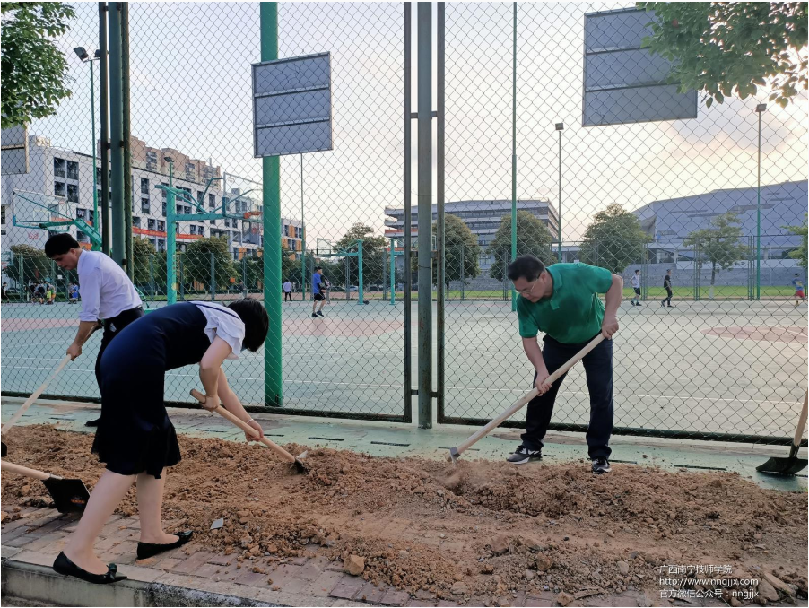 5月15日下午,在学院领导班子的带领下,我院机关科室全体教职员工共70余人到新校区篮球场绿化带参加义务劳动,进行绿化带地块平整及草坪铺设。