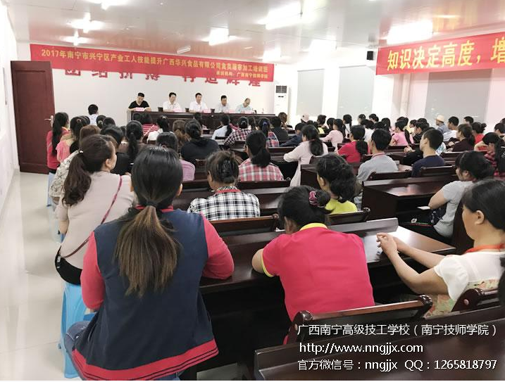 6月2日,由我院非学历培训管理科组织的南宁市兴宁区产业工人技能提升培训广西华兴食品有限公司培训班正式开班。本次培训的工种是禽类屠宰加工工,培训人数为150人。南宁市兴宁区劳动保障中心主任黄治献,南宁市兴宁区劳动保障中心副主任白古松,广西华兴食品有限公司总经理黄国文和我院非学历培训管理科副科长潘伟华等出席了开班仪式。